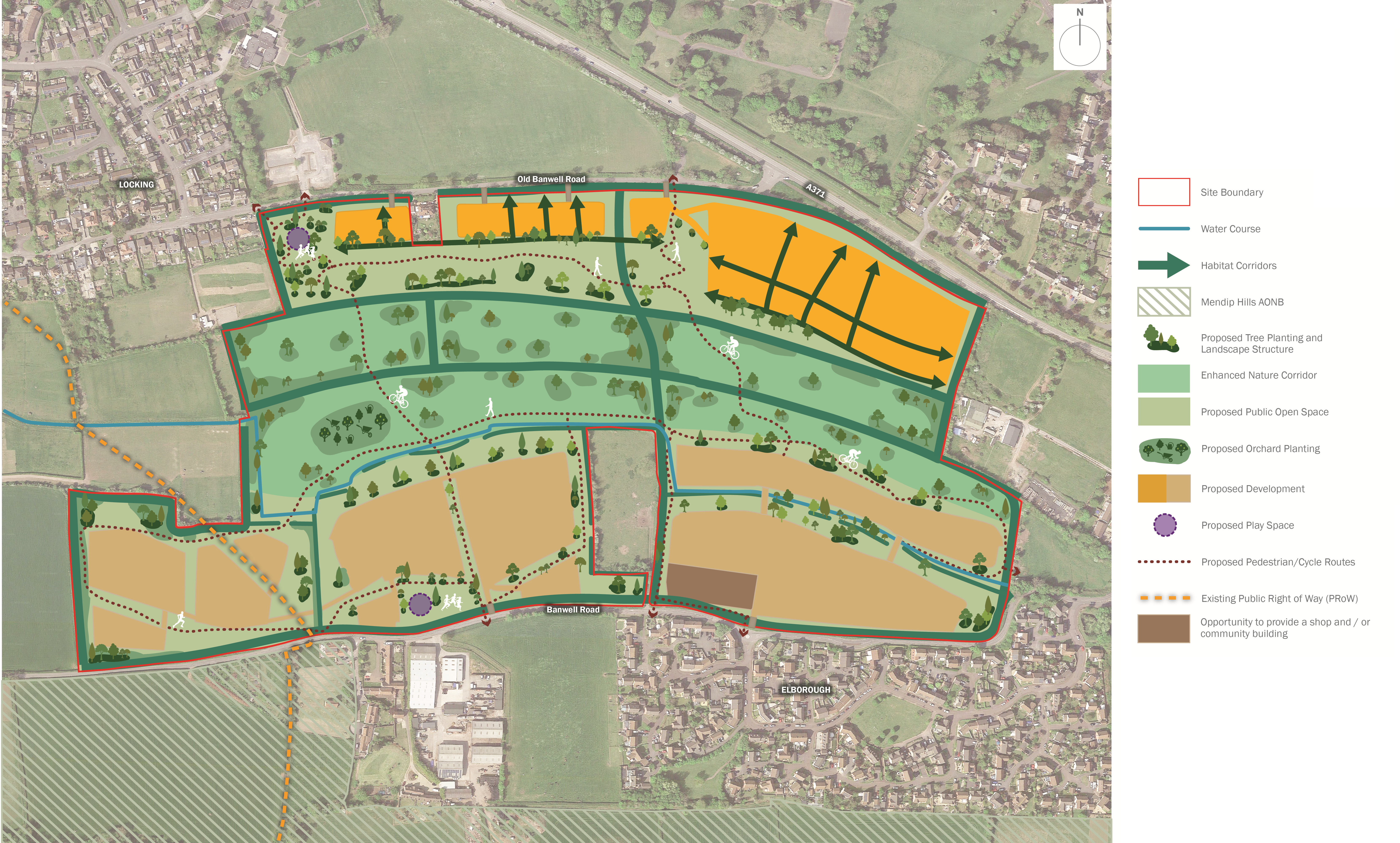Two children’s play areas are also proposed: one next to the proposed new pedestrian access from Locking in the north-east corner, and one to the south opposite Elborough Farm.